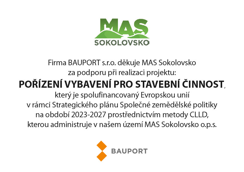 Děkujeme MAS Sokolovsko za podporu při realizaci projektu “BAUPORT - Podpora vybavení společnosti - 2. etapa”, který je spolufinancován Evropskou unií z Evropského zemědělského fondu pro rozvoj venkova na období 2014-2020